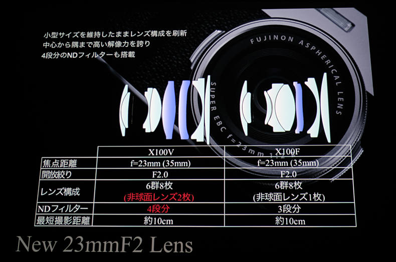 - Using optical technologies developed through the industry-leading "FUJINON lenses," including lenses for cinema cameras, Fujifilm has newly developed a bright prime lens with the focal length of 23mm (equivalent to 35mm in the 35mm film format) and the maximum aperture of F2. The lens, specifically designed for the X100V using two aspherical lens elements, delivers edge-to-edge sharpness in high resolution and high contrast.