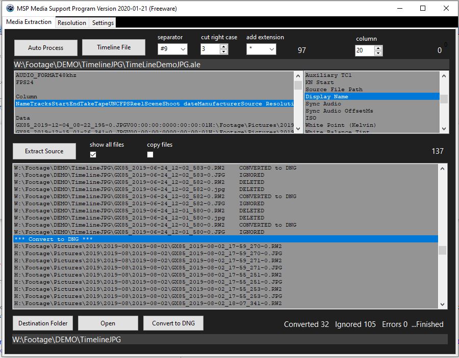 Camera RAW files will then be converted into DNG files by the help of the integrated Adobe DNG converter whereas it’s corresponding RAW and JPG file will be erased to guarantee clean re-linking.