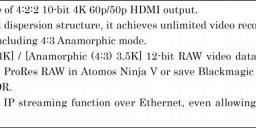 The LUMIX BS1H is capable of 4:2:2 10-bit 4K 60p/50p HDMI output. Designed to satisfy wide-ranging creative needs, the LUMIX BS1H adopts a new heat dispersion structure which achieves unlimited video recording in a variety of recording formats, including 4:3 Anamorphic mode, and provides two alternatives for RAW workflow. [5.9K] / [4K] / [Anamorphic (4:3) 3.5K] 12-bit RAW video data can be output over HDMI to save Apple ProRes RAW on the Atomos Ninja V or save Blackmagic RAW on the Blackmagic Video Assist 12G HDR.