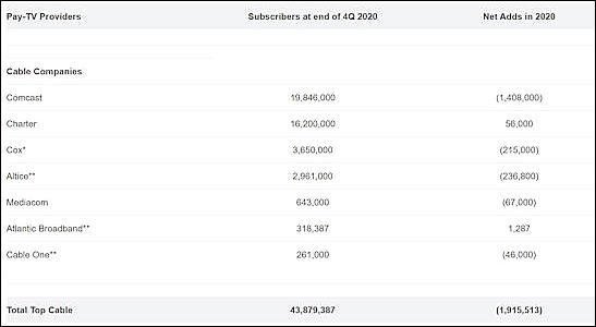 The top seven cable companies lost about 1,915,000 video subscribers in 2020, compared to 1,560,000 subscribers in 2019.