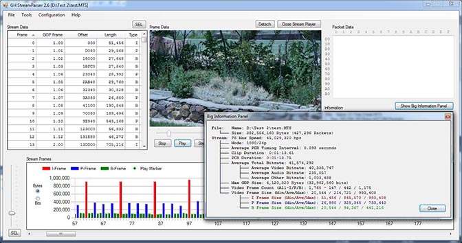 When “Open Stream Player” is pressed in Frames Mode a Windows Media Player window is opened in the Frame Data panel. The player can be detached and displayed in a separate window. When a stream is played a frame marker in the Stream Frames graph follows along. Also shown in the figure below is the window presented when “Show Big Information Panel” is pressed.